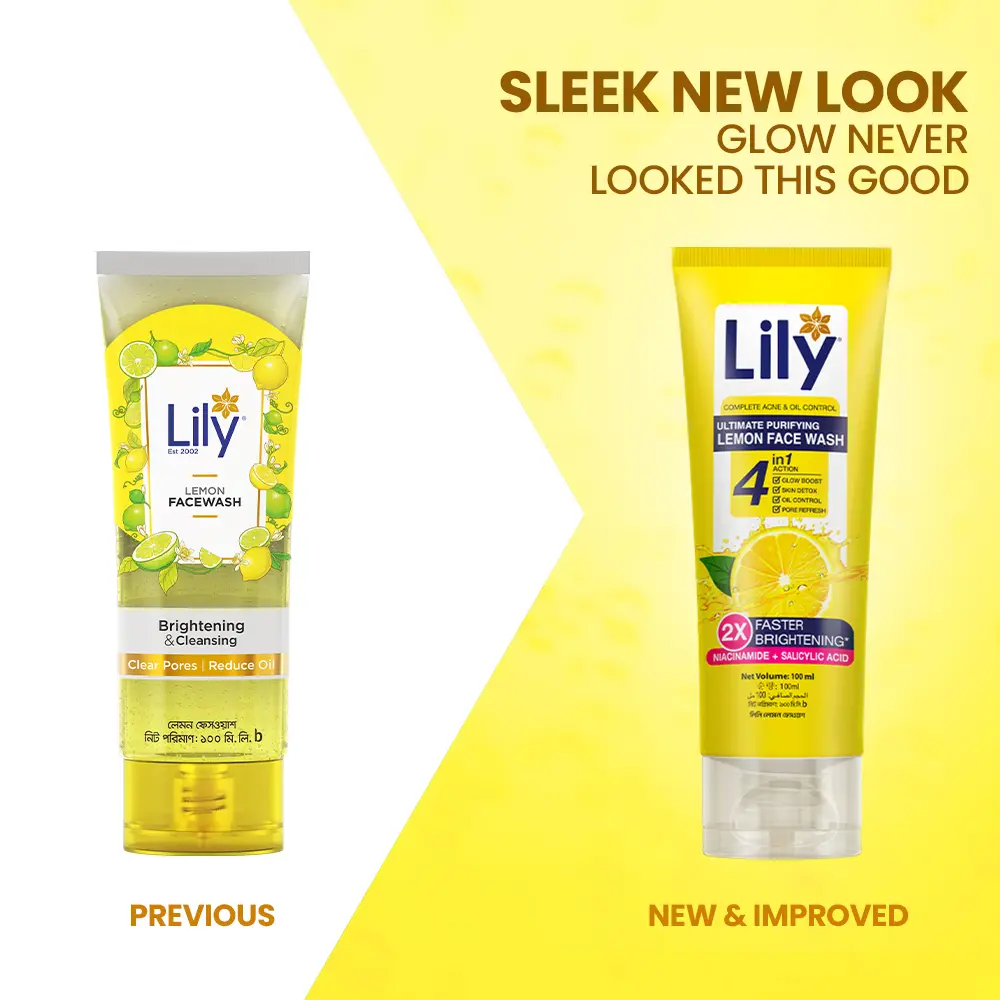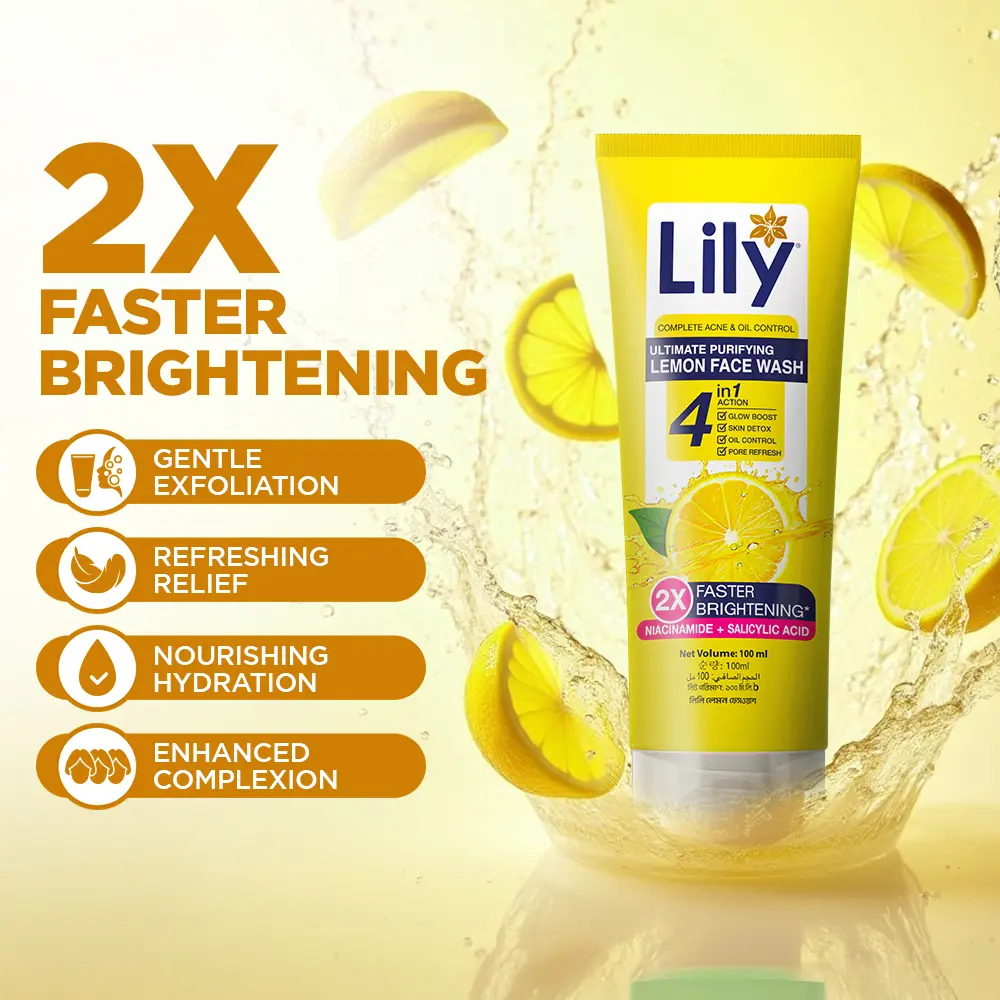 Lily Lemon Face Wash, enriched with Lemon Extract, helps reduce dark spots and brighten the skin with a gentle, soap-free formula. It purifies deeply to leave your skin feeling fresh, clear, and spotless. Powered by Salicylic Acid and Niacinamide, it supports clearer skin, controls excess oil, and delivers 2X Faster Brightening for a visibly radiant complexion.