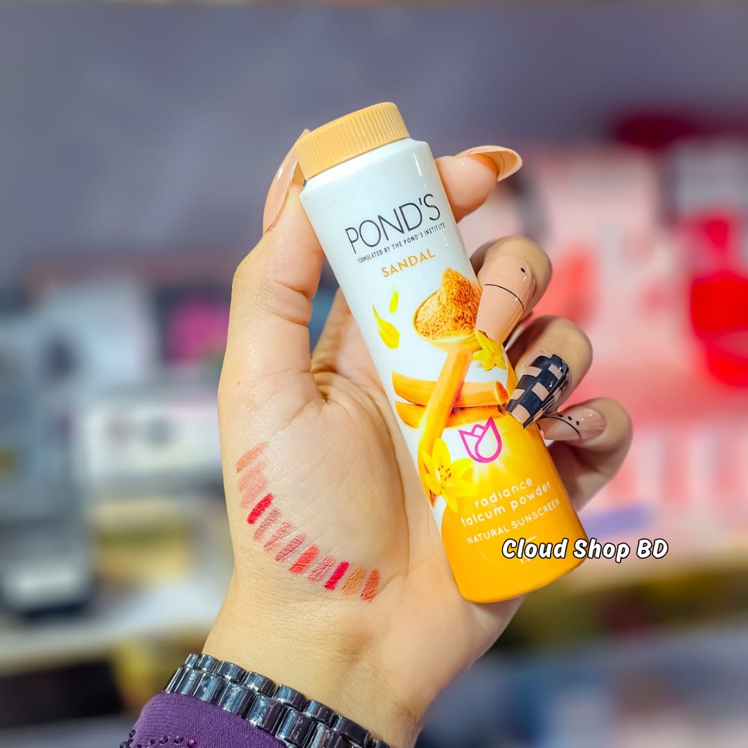 The Pond’s Sandal Radiance Talcum Powder is a refreshing, skin-brightening powder that keeps your skin fresh, smooth, and beautifully fragrant all day long. Enriched with the goodness of sandalwood, it absorbs excess oil, controls sweat, and leaves a natural glow on the skin. The fine, lightweight texture blends effortlessly, giving a soft, radiant finish while keeping you cool and comfortable even in humid weather.